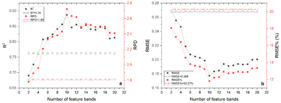 Sensitivity analysis. (a) The hollow line in the figure shows the result obtained by the RS–PLSR method; the black line indicates and the red line indicates RPD. (b) The hollow line in the figure shows the result obtained by the RS–PLSR method; the black line indicates RMSE and the red line indicates RMSE%.