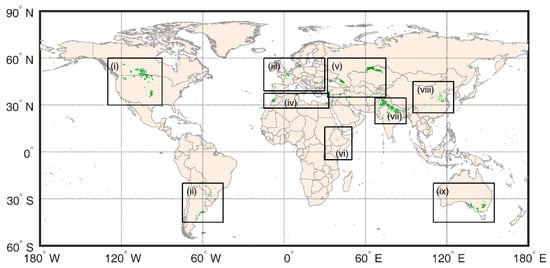 Global wheat (green dots) distribution map. (i)–(ix) represent the nine major wheat-planting regions, i.e., North America, South America, Europe, North Africa, Central-West Asia, East Africa, South Asia, China, and Australia.
