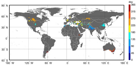 The results show that WHD values calculated using the logistic-based method occurred slightly earlier by an average of 6.0 days than those derived by the threshold-based method, while WHD values from the shape-based method occurred slightly later by about 6.5 days than those from the threshold-based method. Spatially, WHDs estimated by all three methods were generally delayed from the low to mid latitudes (Figure S1a–c). By averaging WHD values from the three methods over all the years in each grid, we found that except for Chile, where wheat is harvested in late December or early January, the earliest WHD values occurred primarily in southern South Asia (from late February to March) (Figure 2). In northern South Asia, as well as Egypt and Morocco in North Africa, farmers usually harvest wheat from April to mid-May. In China, West Asia, Europe, as well as southern Central Asia and North America, wheat normally matures from mid-May to mid-August. For the northernmost wheat-growing areas in Canada, Russia, and Kazakhstan, wheat is usually harvested in late August and September. By comparison, WHD in Ethiopia and the Southern Hemisphere generally range from October to the end of the year.