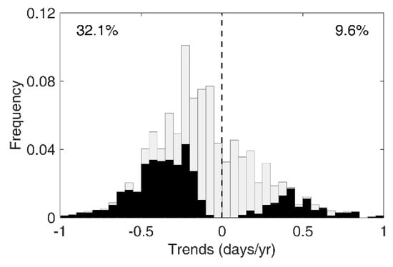 The frequency of WHD variation trends. The black bars indicate significant trends at the significance level of 0.05.