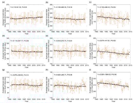 It should be noted that there are still some uncertainties in this study. First of all, because there were no published annual wheat distribution maps available, we were forced to use the 2005 wheat extent map to determine the range of wheat distribution for all the years. However, in fact, the crop planting system is very complicated. In some places, farmers may grow wheat this year, but switch to another crop next year. For a particular pixel, the percentage of wheat may vary from 1981 to 2014. It is urgent to produce annual wheat distribution maps for a more accurate temporal pattern analysis of wheat phenology. Second, we defined the percentage of wheat grown >30% as wheat pixels. Thus, the estimated wheat harvest timing was inevitably affected by other crops or land covers. Given the relatively coarse spatial resolution of the pixels in this study, only a few pixels have a wheat-planting percentage >50%. Future research is best done on pixels with a higher percentage of wheat grown or even on pure wheat pixels.