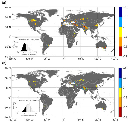 The spatial patterns of correlation coefficients (a) between WHD and NDD, and (b) between WHD and EDD. The inset is correlation coefficient frequency.