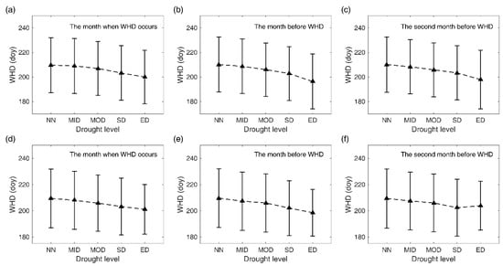 Wheat harvest date comparison at different drought levels in the month when WHD occurs, in the month before WHD, and in the second month before WHD. (a)–(c): PDSI; (d)–(f): SPEI. NN: near normal; MID: mild drought; MOD: moderate drought; SD: severe drought; ED: extreme drought.