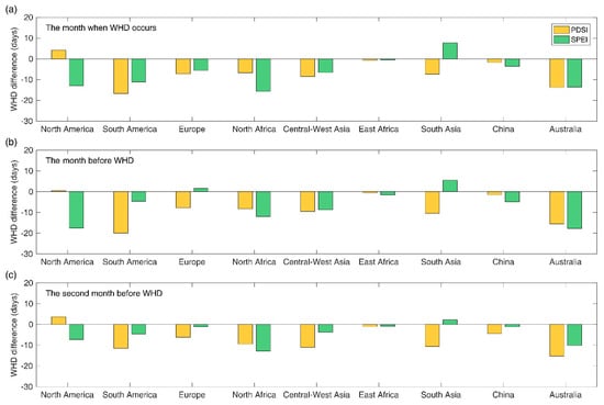 Difference in WHD between extreme-drought years and normal years based on PDSI (yellow) and SPEI (green). (a) Drought conditions in the month when WHD occurs; (b) drought conditions in the month before WHD; (c) drought conditions in the second month before WHD.