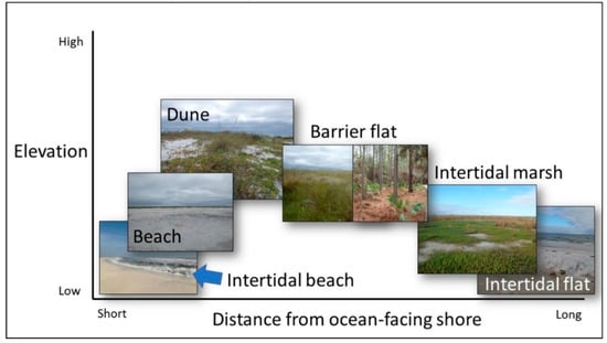 | Barrier flat | Barrier flat includes flat or gently sloping supratidal/upland areas that are located on the backslope of dunes, unvegetated washover fans, and areas along estuarine shorelines. Barrier flat habitat can be unvegetated or vegetated (i.e., meadow). | [9,35] |