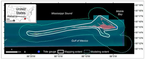 Dauphin Island is part of a 105 km-wide Mississippi–Alabama, wave-dominated barrier island chain (Figure 2) [36,37]. The island is backed by the shallow (<4 m deep) Mississippi Sound [37] and is flanked to the east by Mobile Bay. In 2015, the length of Dauphin Island was about 25 km, and the subaerial portion of the island was estimated to be about 15.8 km2 [28]. Situated in the northern Gulf of Mexico, Dauphin Island experiences diurnal tides with a mean tidal range of about 0.36 m (i.e., mean low water to mean high water), based on observations during the most recent North American Tidal Datum Epoch (NTDE; 1983 to 2001) from a National Oceanic and Atmospheric Administration tide gauge (station ID: 8735180) on the island. We developed the modeling domain for this study (dashed outline in Figure 2) by buffering the maximum extent of Dauphin Island shorelines from 1940 to 2015 [38] by 2.5 km. We used Esri ArcMap 10.5.1 (Redlands, California, USA) for all spatial analyses.