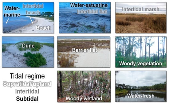 Examples of the habitat classes for the barrier island habitat modeling effort on Dauphin Island, Alabama, USA. The classes are linked to tidal regime (see legend in lower left corner of the figure). The developed class was not shown since it was not explicitly modeled in this effort. Adapted from Enwright et al. [28] with permission.