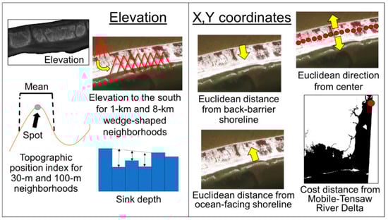 We used the TBDEM to develop numerous landscape position predictor variables based on literature-derived linkages of landscape position to barrier island ecology and habitat distribution [16,19,20,21]. The predictor variables were related to elevation or X, Y coordinates (i.e., proximity and direction; Figure 4). We determined the value of these predictor variables for each 10 m pixel in the TBDEM. We used the topographic position index [48] as a measure of relative topography. This was calculated by subtracting the elevation for a single pixel to that of a neighborhood. Halls et al. [21] used the topographic position index to extract dune habitat. The elevation to the south variables were calculated by taking the median of the maximum elevation for three 22-degree wedge-shaped kernels radiating to the south with radii of 1 km and 8 km. The distance from the Mobile-Tensaw River Delta was a cost distance, which restricted the distance calculation to subtidal areas identified from the TBDEMs. To do this, we created a cost surface that only included subtidal areas (i.e., intertidal, supratidal, and upland areas were set to “NoData”). For the Euclidean direction from the center variable (Figure 4), we determined Euclidean direction from centroids of 5 m cross-shore transects. We recoded this variable to 1 for directions between 90 degrees and 270 degrees, otherwise the value was set to 0.