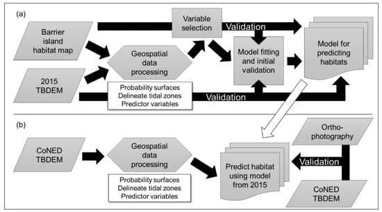 Workflow for the barrier island habitat model development for Dauphin Island, Alabama, USA. (a) Overview of process for developing and validating the contemporary model for predicting barrier island habitats using a habitat map and a topobathymetric (TBDEM) from 2015; (b) Overview of the process for predicting barrier island habitats using historical data from the USGS Coastal National Elevation Dataset (CoNED) TBDEM using the model fitted with contemporary data (i.e., hindcast).