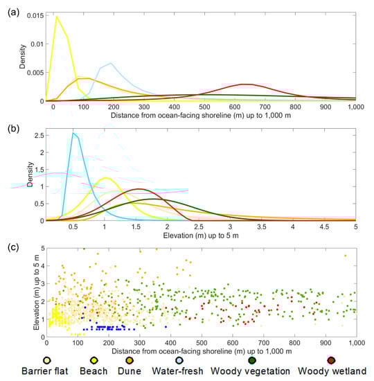 Probability density functions developed from the training data for the supratidal/upland zone from the contemporary (i.e., 2015) habitat model for Dauphin Island, Alabama, USA. (a) Distance (m) from the ocean-facing shoreline up to 1000 m; (b) Elevation (m) up to 5 m; and (c) a bivariate plot for these two variables.