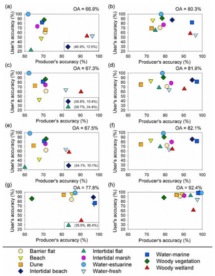 Producer’s and user’s accuracy results for the barrier island habitat model effort for Dauphin Island, Alabama, USA. (a) Class-specific deterministic accuracies for the final contemporary model without post-processing. (b) Class-specific fuzzy accuracies for the final contemporary model without post-processing. (c) Class-specific deterministic accuracies for the final contemporary model with post-processing, but no minimum mapping unit (MMU). (d) Class-specific fuzzy accuracies for the final contemporary model with post-processing, but no minimum mapping unit (MMU). (e) Class-specific deterministic accuracies for the final contemporary model with post-processing and a four-pixel MMU. (f) Class-specific fuzzy accuracies for the final contemporary model with post-processing and a four-pixel MMU. (g) Class-specific deterministic accuracies for the hindcast model with post-processing and a four-pixel MMU. (h) class-specific fuzzy accuracies for the hindcast model with post-processing and a four-pixel MMU. OA is the overall accuracy of the model results.