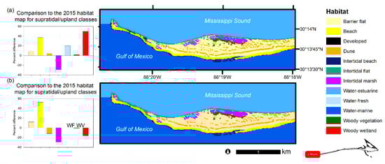 Barrier island habitat contemporary (i.e., 2015) habitat model outputs and percent difference comparison for supratidal/upland habitat compared to the 2015 habitat map Enwright et al. [28], Dauphin Island, Alabama, USA. (a) Contemporary model without post-processing. (b) Contemporary model with post-processing and four-pixel minimum mapping unit.