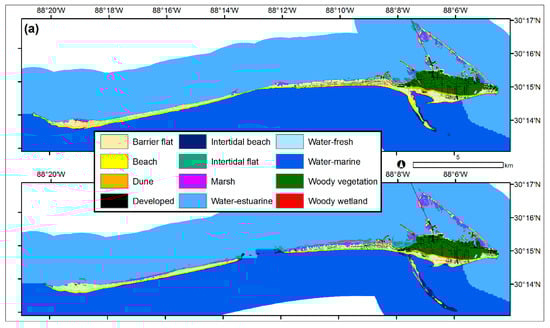 Barrier islands are subaerial expressions consisting of wave-, wind-, and/or tide-deposited sediments [1]. These islands are found along portions of every continent, except Antarctica [2], and provide numerous important ecosystem services including storm surge reduction, wave attenuation, erosion control to the mainland, habitat for fish and wildlife, carbon sequestration in marshes, water catchment and purification, recreation, and tourism [3,4,5]. Barrier islands tend to be dynamic because of their location along the estuarine–marine interface. Collectively, these factors make barrier island monitoring a critical need of natural resource managers for coastal management, such as planning for coastal protection and restoration. As a result, natural resource managers often use habitat maps developed by geographers and remote sensing scientists to gain insights into how these islands are changing over time [6,7,8,9,10]. Besides gradual changes caused by constant forces, such as currents and tides, barrier islands face numerous threats including hurricanes, accelerated sea-level rise, oil spills, and anthropogenic impacts [11]. These threats are likely to influence the future of barrier islands in the latter part of the 21st century, especially as climate-related threats to coastal areas are expected to increase in the future [12,13]. Thus, to better inform both current and future management decisions, resource managers often use scientific models that predict what barrier island systems may look like in the future with regard to morphology [14,15] and habitat for fish and wildlife [16].