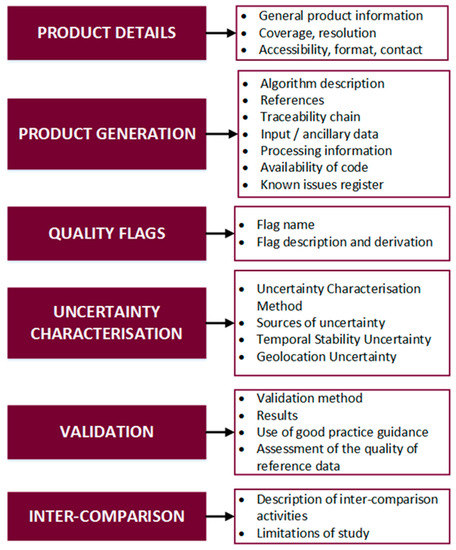 - Nightingale, J.; Boersma, K.F.; Muller, J.-P.; Compernolle, S.; Lambert, J.-C.; Blessing, S.; Giering, R.; Gobron, N.; de Smedt, I.; Coheur, P.; et al. Quality assurance framework development based on six new ECV data products to enhance user confidence for climate applications. Remote Sens. 2018, 10, 21. [Google Scholar] [CrossRef]