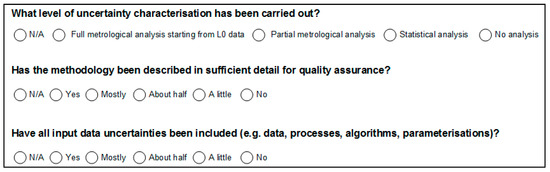 A product evaluation method has been devised that will facilitate assessment of whether the product producer has provided sufficient information within each of the QI sections. It has two key purposes: (1) to allow a user to fully understand the status of the data product and make their own informed judgement as to its applicability for their application; and (2) for both users and funding organisations to determine if good practices are being followed in generating the product. A series of questions for each QI section were compiled for a Reviewer (independent product expert), to answer based on the extent of information presented in the QAT by the product producer. The questions are broad enough to encompass all ECV products and only require the Reviewer to check the most appropriate answer so as to minimise overall effort and reduce subjectivity between different evaluations where possible. Figure 2 shows an example of the evaluation questions within the Uncertainty Characterisation QI section that a reviewer would answer.