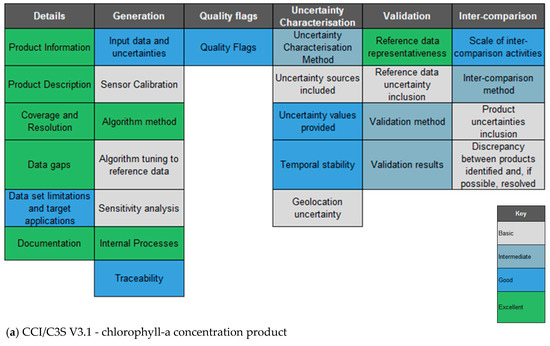 Similar to the evaluation process developed for QA4ECV [3], the EQC evaluation only assesses the fraction of information provided relative to all questions and reviewer assessment of information provided. Four levels of achievement ranging from Basic, Intermediate, Good and Excellent are defined. To achieve a rating of Excellent, almost all QI details per individual section must be provided with substantial credible detail, while a score of Basic would indicate that minimal explanation of a QI was provided and that good practices (if currently available) were not necessarily followed. Figure 3 shows an example of the Quality Evaluation Matrix (QEM) results summary achieved for two Ocean Colour data products. This evaluation indicates the QI sections where sparse information was provided across both datasets, potentially highlighting a scientific knowledge gap to be explored through further funding, as well as QI categories in which more information has only been provided for one product indicating a more in depth assessment of the product quality has been provided by the producer.