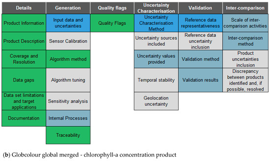 Quality Evaluation Matrices (QEMs) for the (a) CCI/C3S V3.1—chlorophyll-a concentration product and (b) Globcolour global merged—chlorophyll-a concentration product. The CCI product has looked at the temporal stability in an effort to understand its fitness-for-purpose as a Climate Data Record, while Globcolour did no assessment of this. Neither product has been through a formal inter-comparison process highlighting a science gap.