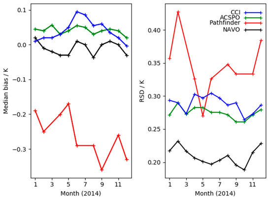 It is vitally important that the retrieval methodologies applied are optimal given the data being used. It has become apparent, however, that there can still be a range of different algorithms used by different groups to derive climate data even when the input data is the same. For example there are at least four different SST products available from the Group for High Resolution Sea Surface Temperature project (GHRSST, [34]) which are based on identical Level-1 inputs from the time-series of AVHRR but which all have different validation statistics. Figure 5 shows the median bias and robust standard deviation (both the median and robust standard deviation are robust to outliers e.g., [35]) for 12 months of SST data from the four SST datasets observed in 2014. It can be seen that they are all different even though they are all measuring the same SST. Ideally it should be possible to develop an optimum algorithm which provides the best estimate in this case rather than having four different approaches.