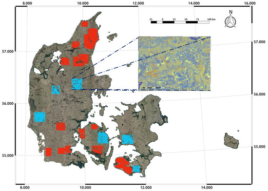 Training and test regions in Denmark (the red and blue color zones represent training and test regions).