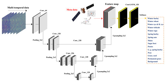 The proposed network can extract the spatiotemporal features successfully using the two main blocks (Figure 4). The first block includes a series of convolution and pooling layers to process input tensors (VV, VH, and VV/VH Sentinel 1 images) and to extract appropriate spatial information such as color and texture properties from different crops in radar images. Also, the second main block consists of ConvLSTM layers for extracting temporal features from multi-temporal images. The input data for the second block are composed of the output of the first block, day and hour of recording images, and incidence near and far angles which all of them normalized between 0 and 1. There were 28 observation dates between May 2017 and August 2017 and all 28 images were fed as one mini-batch into the network in order to train the model based on the different development stages belonging to the classes defined in this research. It should be noted that the shape files were provided by Land-parcel identification system (LPIS), which has an error level about 2.9%. This error level is quite low, enabling us to create a reference image for all input image sequences captured from Sentinel 1 satellite [39].