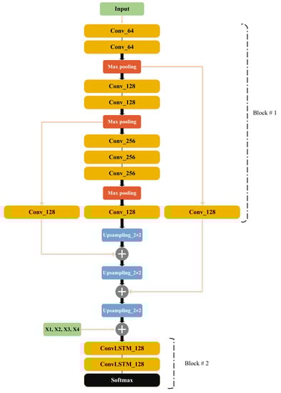 In Figure 2 and Equations (1)–(6), is the current input which is the sequence of observations, T is the maximum length of observations, and d is the input depth, is the output of the previous ConvLSTM block which and are height and width of images, and is the number of recurrent cells, is the output of the previous ConvLSTM block cell memory, is the current block output, and, finally, is the memory output of the current cell. are recurrent weights adjusted during the training process and are the bias terms. , , , and are input, forget, output, and candidate gates, respectively. Also, σ and tanh are the logistic sigmoid and hyperbolic tangent, mapping real numbers to (0,1) and (−1,1), respectively. In the above mathematical equations, * and denote 2D spatial convolution operation and pixel-wise product. Depending on the inputs to each block, each unit makes its decision based on the current input, the output of the previous unit, and the unit's previous memory; it then creates a new output and modifies its memory. Considering the advantages and capabilities of ConvLSTM units, a novel, optimal, and light sequential network combining FCN and ConvLSTM is suggested in this research for sequential data representation. The schematic of the proposed network is illustrated in Figure 3. The network is made up of two main components, Main blocks 1 and 2, which both contain convolutional layers, pooling layers, and ConvLSTM units (Figure 4). Main block 1 takes as input sequential images with a resolution of 96 × 96 pixels. During training and testing 28 were used, but the architecture is able to handle an arbitrary number of images. In the first block the network has two 3 × 3 convolutional layers, followed by a 2 × 2 max-pooling layer. In the second and third blocks, there are two and three 3 × 3 convolutional layers that both are followed by 2 × 2 max-pooling layers. We used a skip connection in the network to preserve features that are extracted in the initial layers and are required for reconstruction in the up-sampling layer. Following Main block 1 is Main block 2, which contains two 3 × 3 ConvLSTM layers. In the recurrent cells, the hyperbolic tangent activation function was used to create the output based on the sequential input data. The score map was obtained from the output of the last ConvLSTM layer and a Softmax layer with same number of neurons as classes was stacked on the last LSTM unit to predict the final multi-class. The Softmax function is a generalization of a logistic function that squashes a k-dimensional vector z of arbitrary real values to a k-dimensional σ = z of real values in the range [0, 1] that add up to 1. It should be noted that developing a lightweight network, which are only about 64 MB in total, is one of the main advantages of this study.