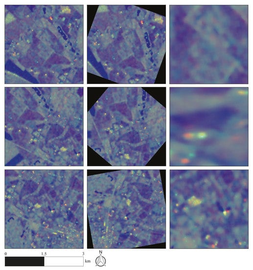 The network was trained from scratch using the Adam optimizer with a learning rate of 0.0001 and a weight decay of 0.0001 per iteration. Each iteration consists of only one sample, which is a time-series that contains 28 images. The loss is based on binary cross-entropy, which is the difference between the predictions and a one-hot representation of the label-images. However, since some classes are harder to recognize than others, focal loss is added to make easily-recognizable pixels contribute less to the loss than hard-to-recognize pixels [40]. Finally all parameters are updated based on the calculated error. Each training sample consists of a 96 × 96 pixel patch, which is randomly cropped from the high-resolution training areas from Figure 1. To increase the generalizability and robustness of the network, the training images and labels were augmented with random scaling (zooming) and rotation (Figure 5).