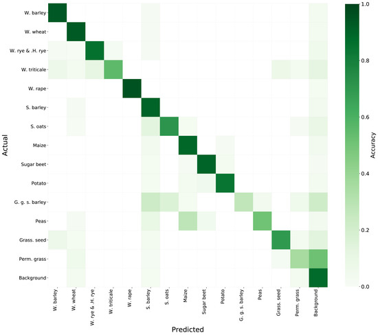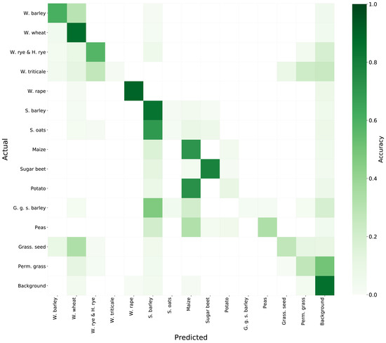 The total test area covers around 254 thousand hectares including the background class. Of this area, background, spring barley, and winter wheat cover 84,917, 39,712, and 35,219 hectares, respectively (Table 1). Thereby, those three classes take up around 62.76% of the total test area. In addition, the areas covered by all 15 classes except green grain spring barley were larger than 1000 hectares. The area covered in this study is, therefore, more than 96 times bigger than that used in [21], which demonstrates the generalizability of our approach. Figure 6 shows a normalized confusion matrix of the predictions on the test set. The average pixel-based accuracy is 86%, showing the success of the proposed method in recognizing 15 different classes using multi-temporal C-band SAR Sentinel 1 images.