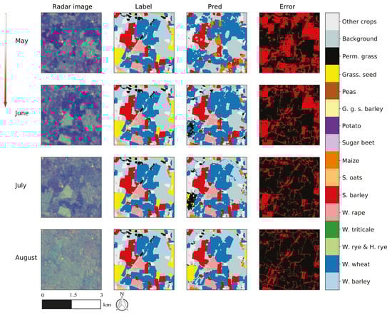One of the important and interesting classes is the background class, which contains all regions that are not registered as farmland such as forest, buildings, roads, lakes, and sea. The pixel-based accuracy for the background class is 88%. One of the reasons for the high accuracy of this class, despite its high intra-class variability, could be the difference in temporal development of the background compared to the other classes. Hence, the pixel intensity of the different crops undergoes essential changes in the four-month main growth period; no such changes were found for background class pixels in the same period of time. The positive impact of temporal information can be seen in Figure 7, where the performance of our approach in July and August was significantly better than that in May.