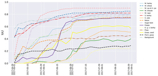 In Table 2, it is shown that the IoU for winter barley and potato, respectively, were 0.42 and 0.09 in May. These figures improved significantly in June to 0.73 and 0.68, respectively. The phonological profiles for winter barley and wheat were close in May, but in the next month phonological changes for these two crops started to differ. Thus, the model could separate winter barley from winter wheat well when including the data in June (Figure 8 and Figure 9). Another interesting class is spring oats because the accuracy of this crop was only 1% by the end of May, but reached 71% in July (Table 2). Overall, the accuracy and IoU indices for all classes did not change significantly from the end of July till the end of August (Figure 8 and Figure 9). Therefore, by using only the multi-temporal data from May, June, and July, the proposed model could recognize 15 different classes with the accuracies presented in this study and we could omit multi-temporal images in August from the training procedure (Table 2).