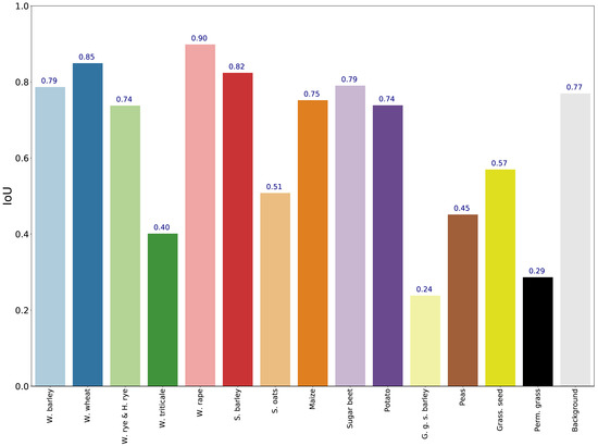 Figure 10 shows the IoU for all classes. This index is extensively used in the semantic segmentation and indicates the degree of overlap between the reference image and the output of the network; thus, the IoU alongside the pixel-based accuracy reveals the performance of the proposed network clearly. The mean value of the IoU index was found to be 0.64; however, as it can be seen in Figure 10, the IoU varied for different classes based on the amount of complexity or the degree of dissimilarity within each class. Winter rapeseed with 0.90 had the highest IoU; green grain spring barley had the lowest IoU of 0.24. Only a few fields of green grain spring barley were predicted correctly and this crop was thus the most complicated case in the current research (Figure 10). This could be because green grain spring barley has a growth pattern similar to spring barley; furthermore, the harvest of this crop was conducted only two weeks before the harvest of the spring barley crop.
