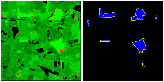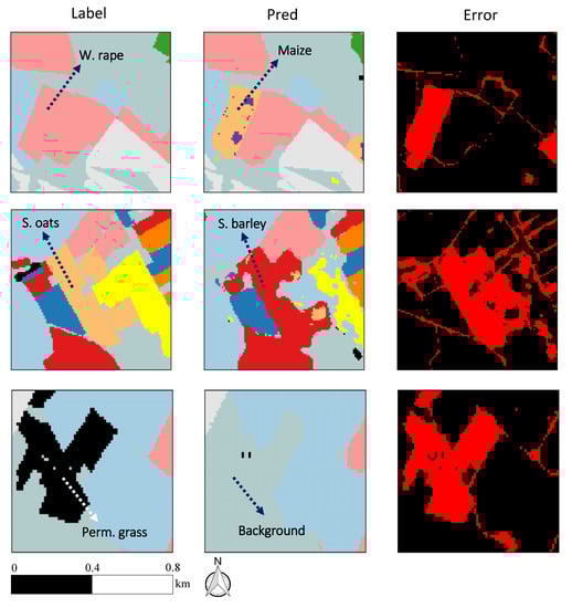 One of the main advantages of the proposed network is the identification of fields that are likely annotated incorrectly in the reference images. As an example, in Figure 13, three different fields in the reference image were annotated as winter rapeseed, spring oats, and permanent grass, while our approach classified them as maize, spring barley, and background, respectively, with high confidence and sharp field boundaries. Thus, we may be able to improve the performance of the network if all the reference data are annotated correctly (Figure 13).