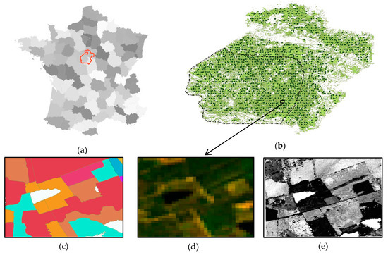 Localization of the study area (a), showing (b) the forest mask and the 775 national forest inventory plots in the main and the subset (southwestern part below dotted line) areas; 1 km2 tiles of (c) the forest type map; (d) a 30 m resolution Landsat color composition (bands 4,3,2); and (e) a 1 m resolution photogrammetric canopy height model. The position of the tile used to illustrate is shown as a black rectangle in (b).