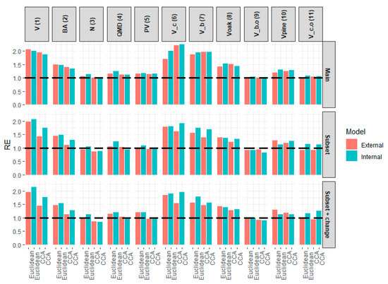 The results of the external validation are presented in Figure 2. Over the main area, the mean RE obtained with the Euclidean distance was 1.45 for the internal model and 1.38 for the external model. REs obtained with the CCA distance were of the same magnitude, with an internal RE of 1.41 and an external one slightly greater with a value of 1.42. The results obtained over the subset area showed the limitation of CCA distance associated with respect to the number of field sample units. Using the Euclidean distance, the greatest REs were obtained using the change detection metrics, with values of 1.41 and 1.35 for the internal and external models, respectively. This is 0.04 and 0.05 greater than the RE achieved without considering change metrics. By comparison, the greatest RE output with the CCA distance were almost similar to the two sets of metrics, reaching 1.27 with the internal models and 1.16 and 1.15 with the external models with and without change metrics, respectively.