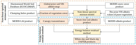 The flowchart of the energy balance residual method to generate the white-sky and black-sky FAPAR products using the MODIS datasets.