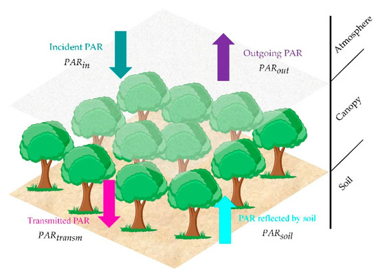 In this paper, we employed the layer approach to describe the non-linear contribution of soil background and leaves within the upper canopy on the canopy albedo (Figure 3b). The layer approach was used to account for the contribution of leaves within the upper canopy and soil substrate on the canopy albedo, which treats the upper canopy as semi-transparent for the radiation input [62]. The transmitted PAR above the soil substrate can be determined using Beer’s law,