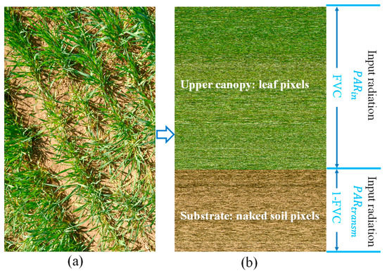 A physical representation of a non-linear spectral mixture model to simplify the dual-source vegetation–soil lay approach. (a) The vertical digital photo of a wheat canopy; (b) the re-ordered image of (a), in which the leaf and soil pixels are placed side by side in the form of a mosaic. For the soil substrate, its input radiation is attenuated by the leaves of the upper canopy. FVC is the fraction of vegetation cover, and are the incident and transmitted photosynthetically active radiation, respectively.