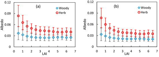 Variations of the white-sky (a) and black-sky (b) VIS albedo of woody vegetation and herbaceous vegetation with different LAI. The error bar is the standard deviation.