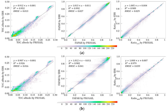 Evaluation of the EBR approach using the 81,000 simulations by PROSAIL. (a) “True” values of the leaf extinction coefficient (k), , and G(θ) were available from PROSAIL simulations, (b) the prior parameters were fixed (k = 0.88, G(θ) = 0.5, = 0.025).