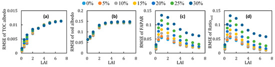 The mean RMSE of the retrieved TOC VIS albedo, soil VIS albedo, FAPAR, and soil-absorbed fraction of PAR using the EBR method for the 81,000 simulations with a Gaussian random noise in the LAI values (0% to 30%). Figures (a–d) correspond to the TOC VIS albedo, soil VIS albedo, FAPAR, and soil-absorbed fraction of PAR, respectively.