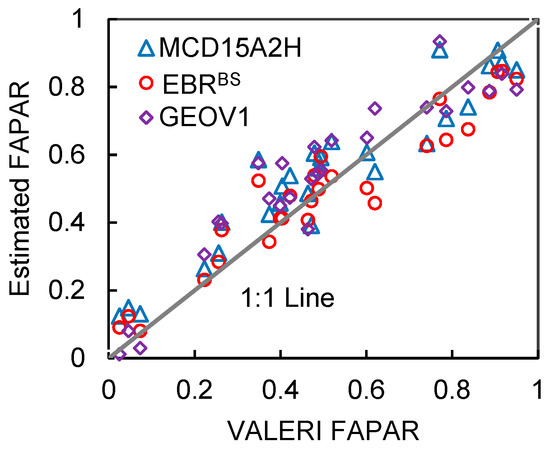 The 27 high-resolution FAPAR maps covering 22 VALERI project sites were used to validate the accuracy of the FAPAR product constructed using the EBR method and also for comparison with the MCD15A2H and GEOV1 FAPAR products. The ground-based datasets were provided by the VALERI project (http://w3.avignon.inra.fr/valeri/). All the in situ FAPAR values were calculated from the digital hemispherical photos taken at the VALERI sites during 2001–2005 [28,44]. The validation with ground-based data was achieved by scaling up the in situ measurements using fine-resolution imagery that had a resolution of 20 m [45]. All these satellite FAPAR products were validated using the mean values for an area of 3 km × 3 km, which enabled the effects of the point spread function and geometric accuracy to be limited. More details about the VALERI project and dataset are presented in Baret et al. [46].
