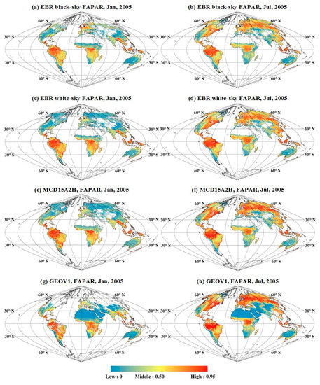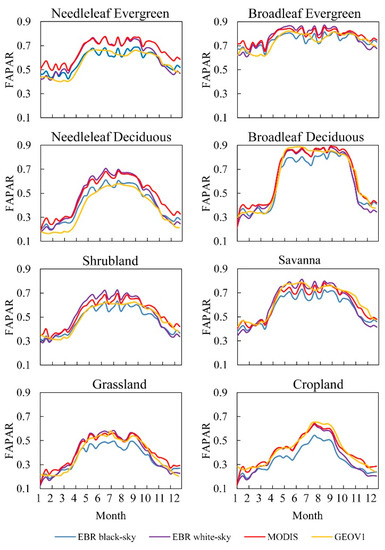 Figure 13 illustrates the seasonal variations in the FAPAR for different vegetation types within tile H10V05 in 2005. The EBR black-sky FAPAR was smaller than the white-sky FAPAR outside the winter season with the large SZA. The EBR white-sky FAPAR agreed well with the MODIS FAPAR but was smaller than the MODIS FAPAR in the spring and winter seasons. The EBR black-sky FAPAR was noticeably smaller than the MODIS FAPAR for all land cover types. The GEOV1 and MODIS FAPARs agreed with the EBR white-sky FAPAR at broadleaf deciduous forests, savannas, grasslands, and croplands. For these biomes, the EBR black-sky FAPARs were notably lower than the other FAPAR estimates. However, the EBR black-sky FAPAR agreed well with the GEOV1 for needleleaf forests and shrublands.