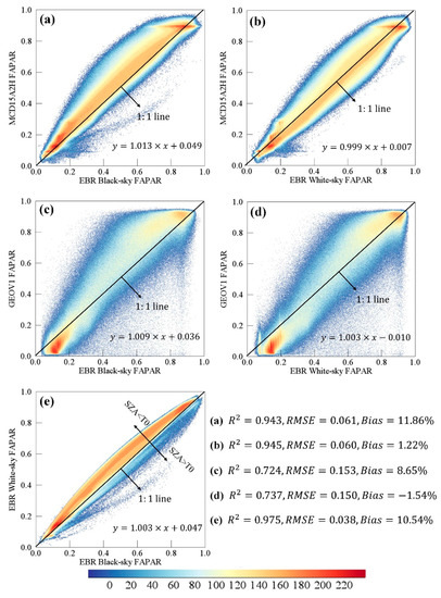 Comparison of FAPAR estimates for July 2005: (a–b) EBR black-sky and white-sky FAPARs against MOD15A2H FAPAR; (c–d) EBR black-sky and white-sky FAPARs against GEOV1 FAPAR; and (e) EBR black-sky FAPAR against EBR white-sky FAPAR (Note that the Sun Zenith Angle (SZA) threshold value (T0) was approximately 60).