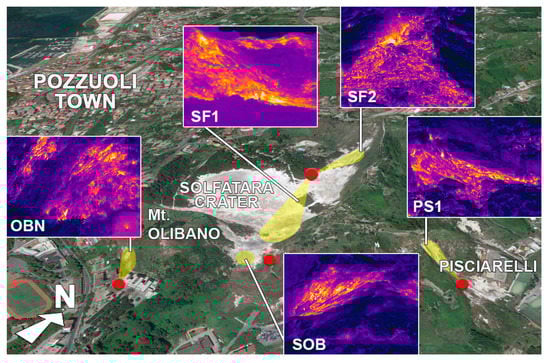 Location of the TIRNet permanent stations (red dots) and the investigated regions (yellow areas). The corresponding infrared (IR) images are shown inside white frames. SF1 = Solfatara Station 1; SF2 = Solfatara Station 2; SOB = Solfatara OB Station; OBN = Olibano Station; PS1 = Pisciarelli Station.
