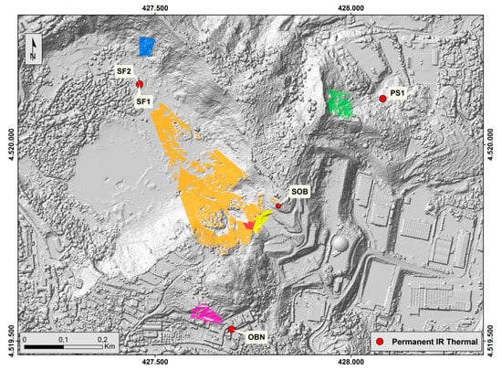 The process of orthorectification of the TGF into the UTM WGS84 coordinate system [65] was performed by using a set of Ground Control Points (GCP) identified both on the TGF and on a Digital Surface Model (DSM) [66] of the studied area. A viewshed analysis was performed for each station by taking into account the field of view (FoV) of thermal cameras, the line of sight and the DSM [64]. In this way, the areas of visibility to use in the further analysis were identified (Figure 3). In particular, the SF1 frame was subdivided into three subsets characterized by different distances between the sensor and the target (Figure 4a).