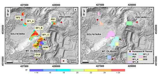 (a) Draped and georeferenced TIR ground frames (TGF) of SF1, SF2, OBN, PS1 and SOB stations. The image of the SF1 Station is split into three coherent parts with different focal geometry (SF1_A/B/C); (b) polygons obtained by grouping cells containing data from TIRNet stations. SF1_A/B/C= Solfatara Station 1; SF2 = Solfatara Station 2; SOB = Solfatara OB Station; OBN = Olibano Station; PS1 = Pisciarelli Station. TIR images were acquired at night time (00:00–04:00).