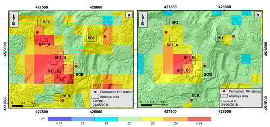 Polygons defining common areas shown in Figure 4b overlapping ASTER (a) and L8 (b) thermal data of 1 June 2018 and 24 May 2018, respectively.