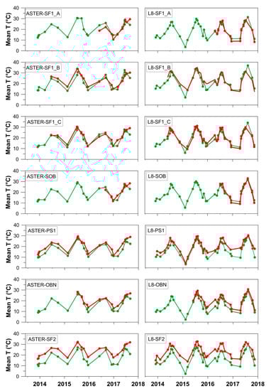 Time-series of temperature values inside the analysis areas were created by using the zonal statistical function (ArcGIS© algorithm [64]) which calculates the mean, minimum and maximum temperature values of the analysis areas belonging to all TGF and TSF. The plots in Figure 6 show the comparison between mean temperature values of analysis areas in the TGF and mean temperature values of the same areas in the TSF.