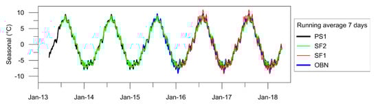 Plots of seasonality values extracted from temperature time-series of PS1, SF2, SF1 and OBN TIRNet ground stations.