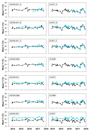 Regarding the temperature time-series in Figure 8, some observations can be made: (1) ASTER mean temperatures were characterized by a more stable trend then L8 mean temperatures, probably due to the lower sampling rate of ASTER data; (2) in the first months of 2015, L8 time-series showed a negative peak, likely due to a very cold end of winter; (3) both ASTER and L8 data showed a negative peak corresponding to October 2015.