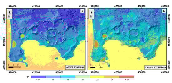 Maps of land surface median temperature values of ASTER (a) and L8 (b) de-seasoned time-series.